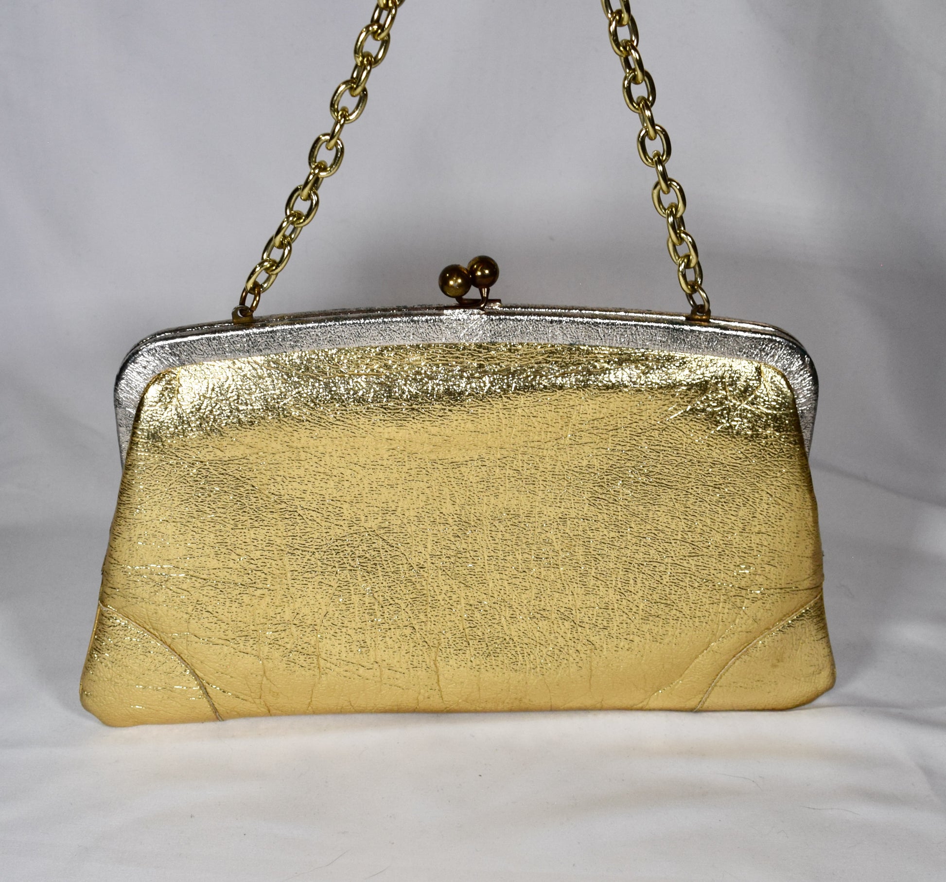 Ingber gold faux-leather handbag, lined in champagne coloured satin, with a zippered pocket inside. Closes with ball click clasp. The chain can be tucked inside to be a clutch. Made in the USA.