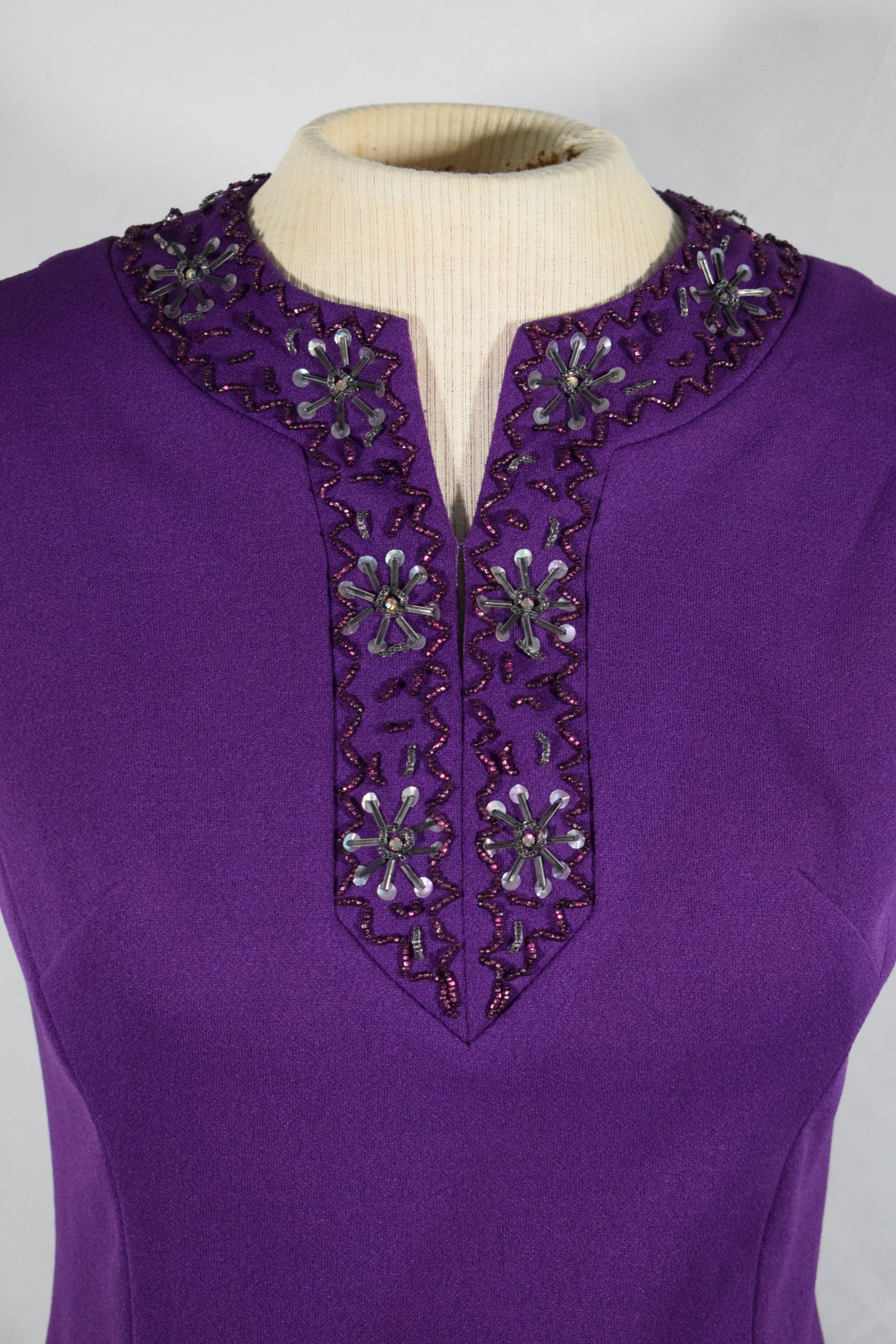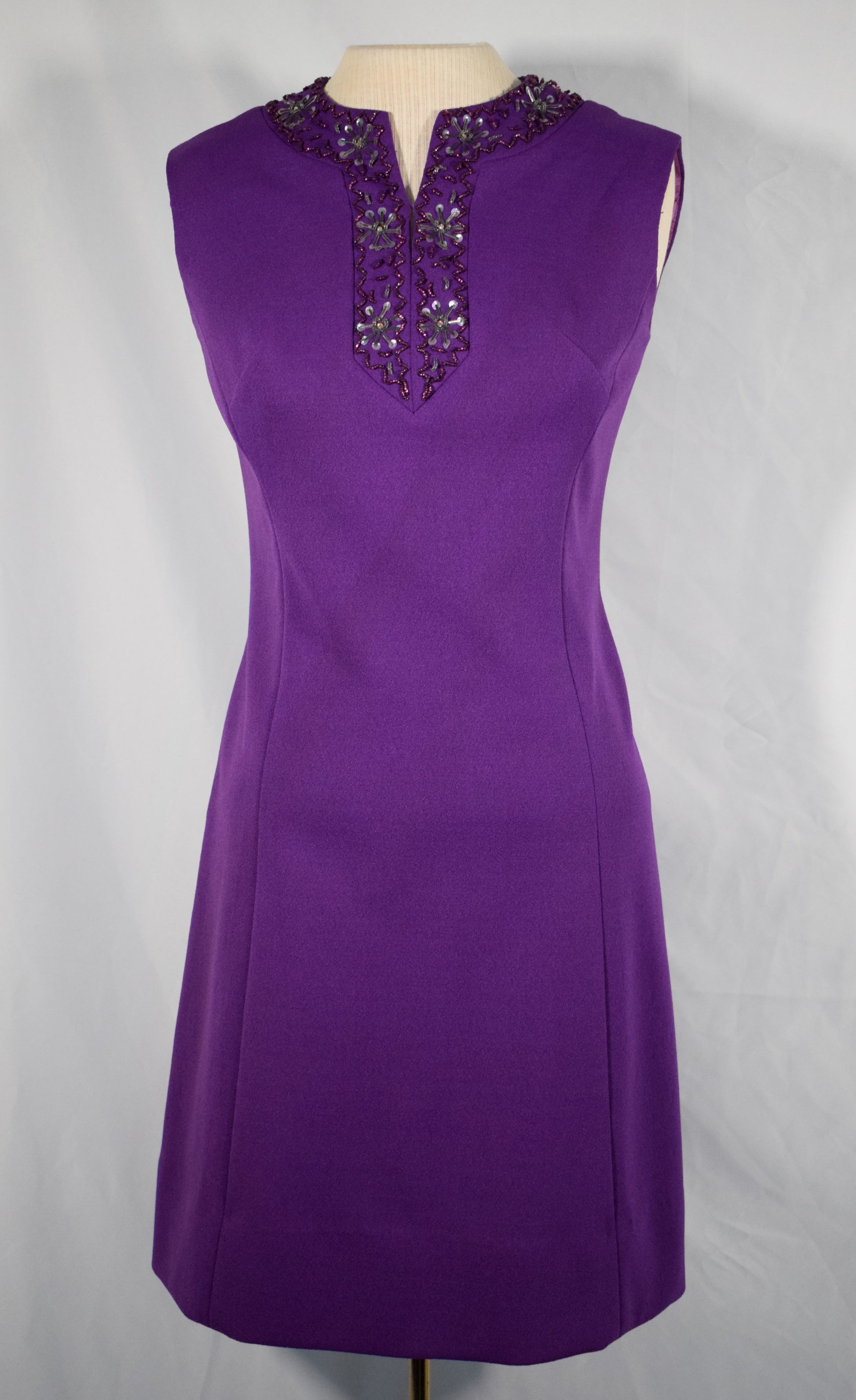 Purple polyester, sleeveless dress, by NuMode. Tunic neckline has beading around it. Zipper down the centre back. Made in Toronto.