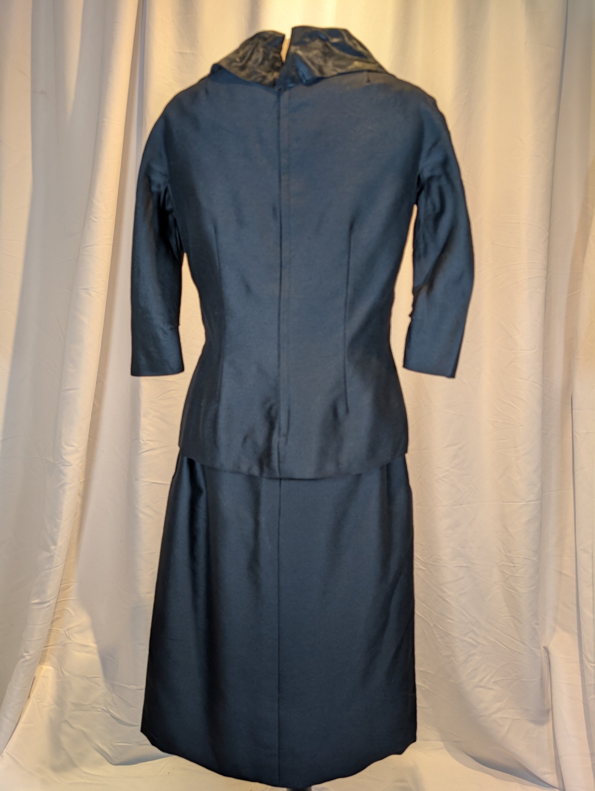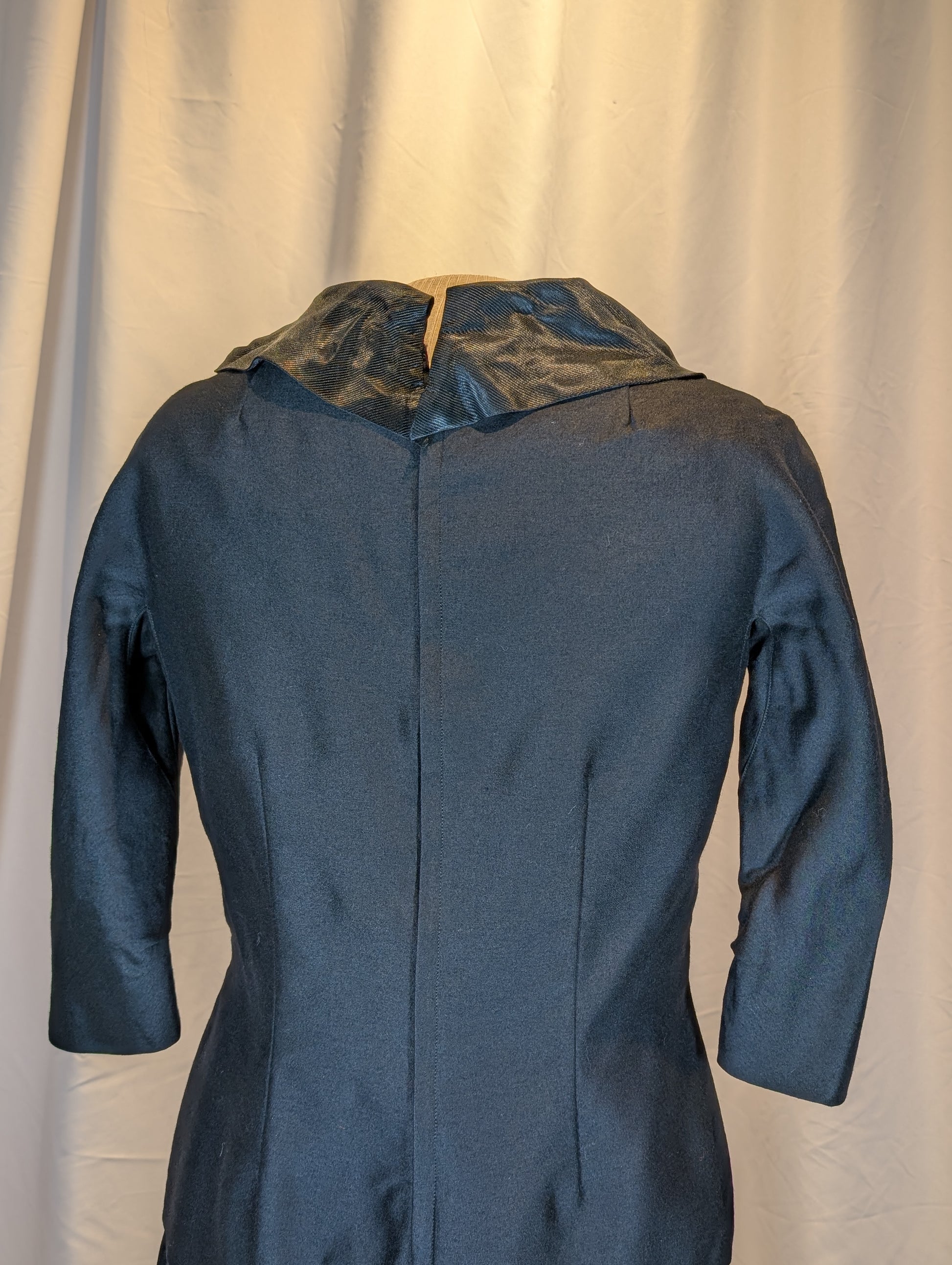 Two piece dress with ¾ sleeves. Sleeveless under dress is attached to the top at the shoulder. Zippers up the back of both the dress and jacket. Textured satin collar that creates an off-centred bow at the front. No armscye, princess seams with pleats. The upper part of the under dress is polyester lining. Polyester.