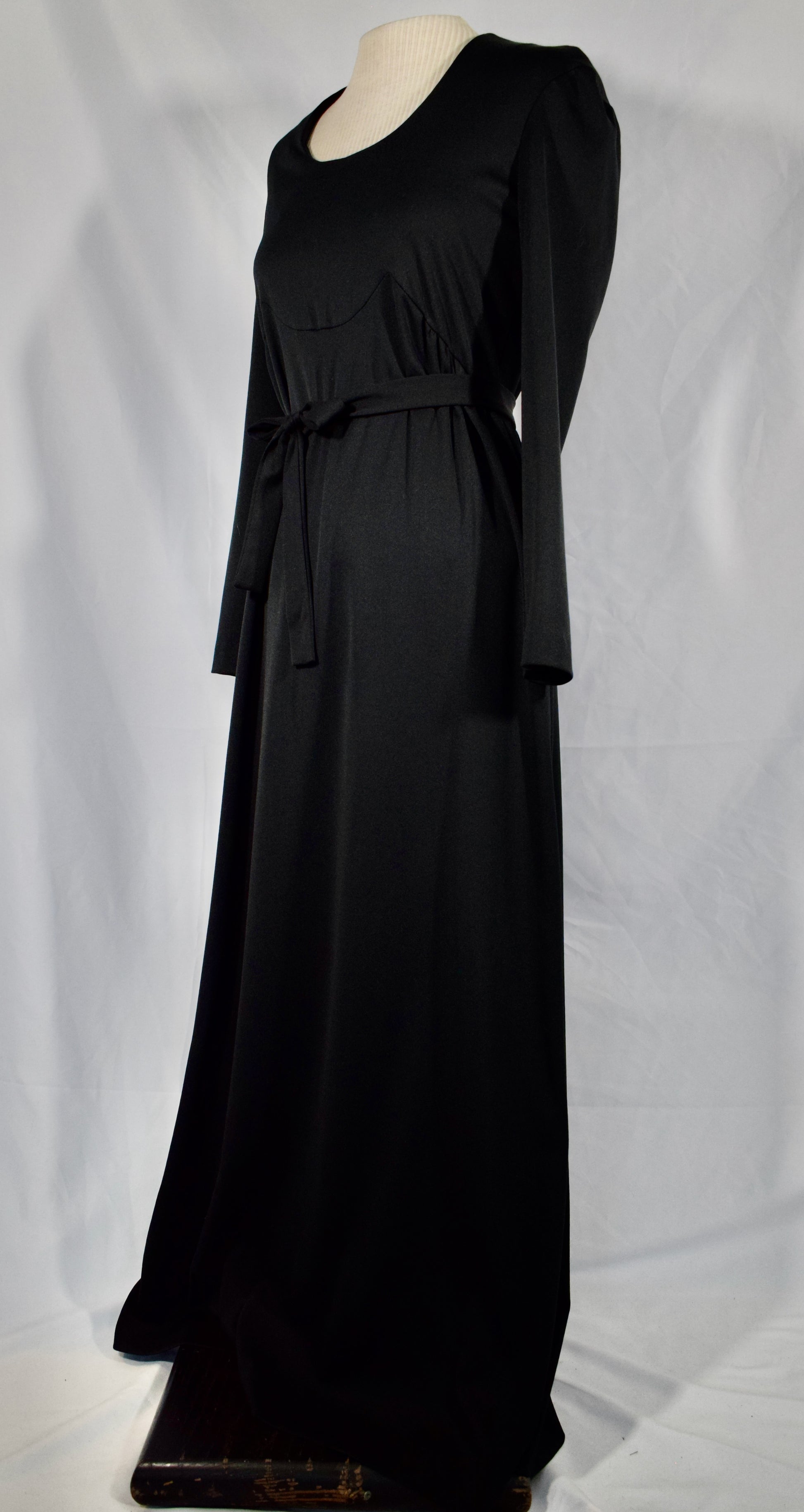 1970s dress by Normie Hum. Long sleeved, stretch polyester, with peaked waistline. tie belt. Made in Canada. Zip down centre back.