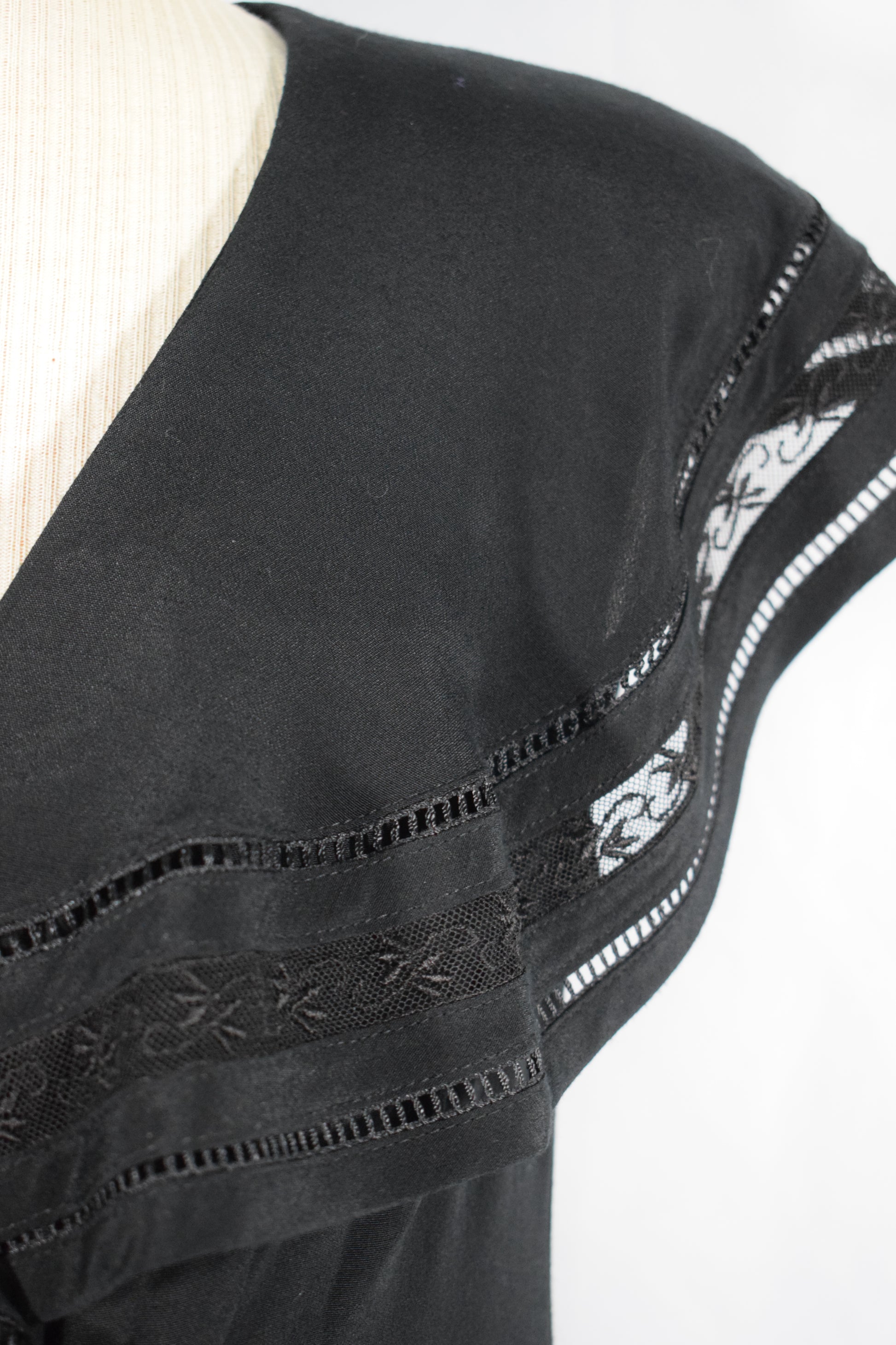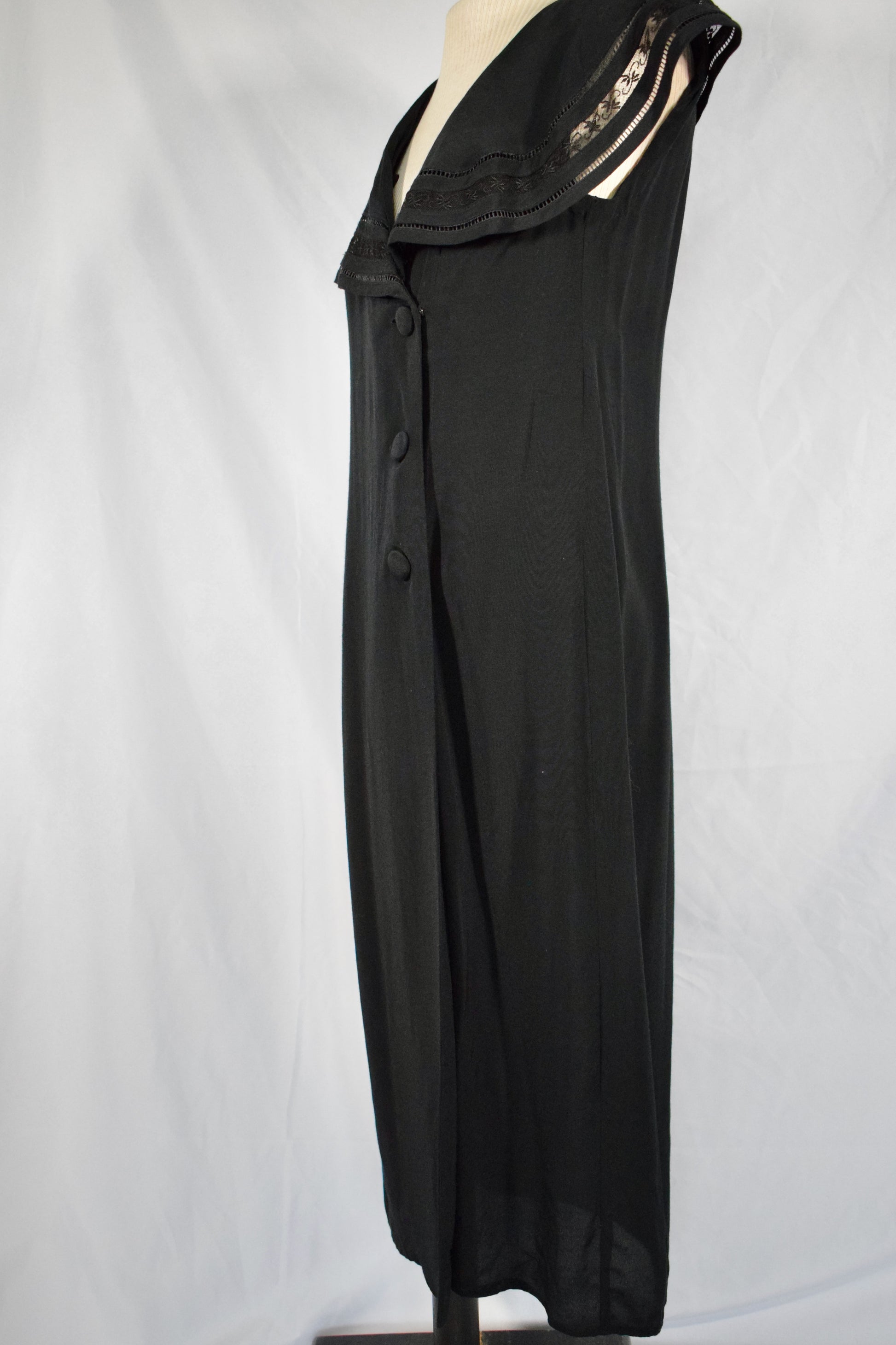 Black rayon, sleeveless, summer dress, with a wide collar, edged in lace and tatting. Does up with three 1” buttons, and snaps. Interior button to wrap on the inside. At the shoulder the collar is 8” wide, bypassing the dress by 3”. The shoulders also have shoulder pads, helping the collar be prominent. The collar creates a deep neckline. Made in Korea