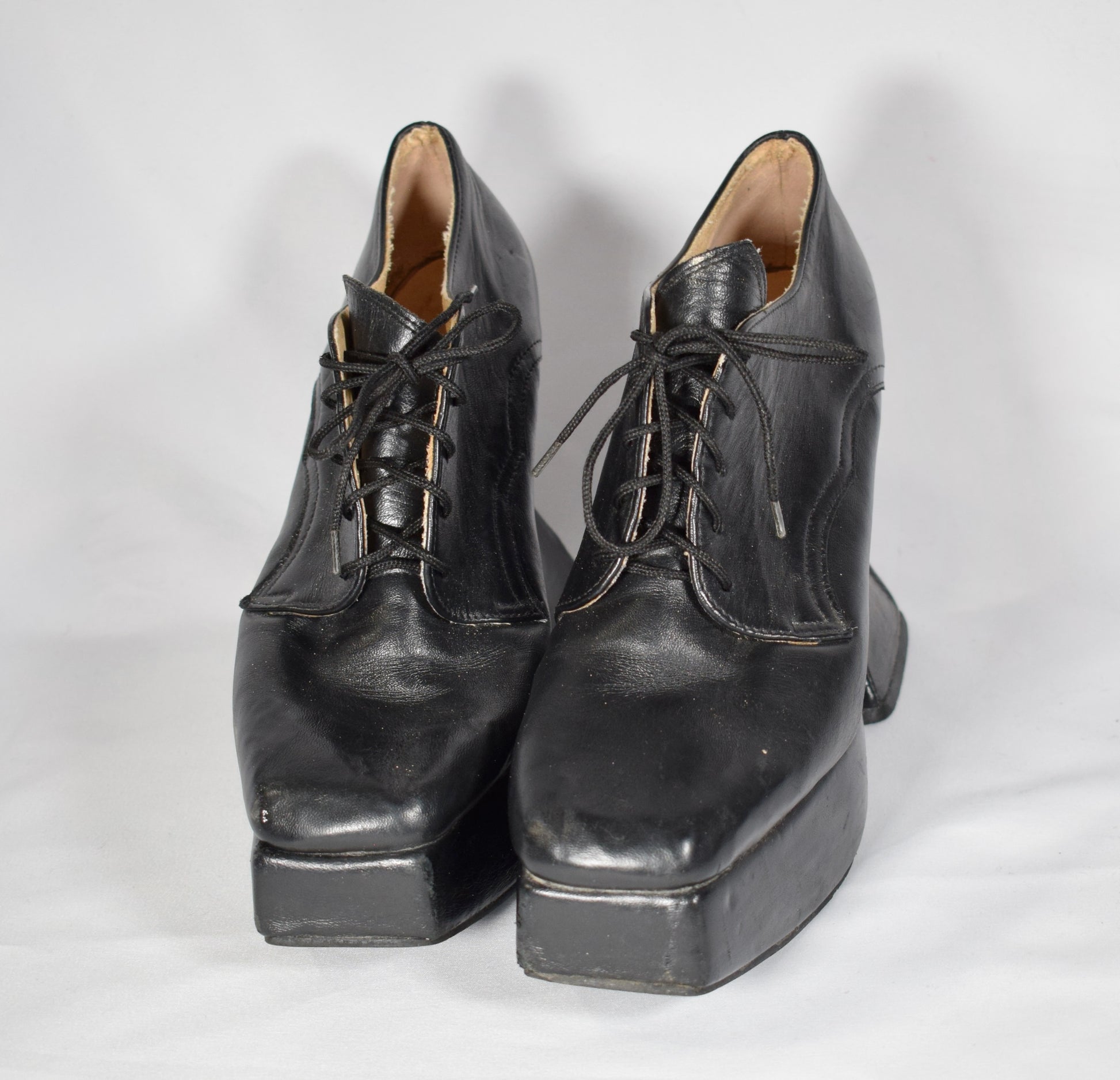 Black leather shoes with pyramid shaped heels, square toes, and 1.5” platforms. 5” heels.