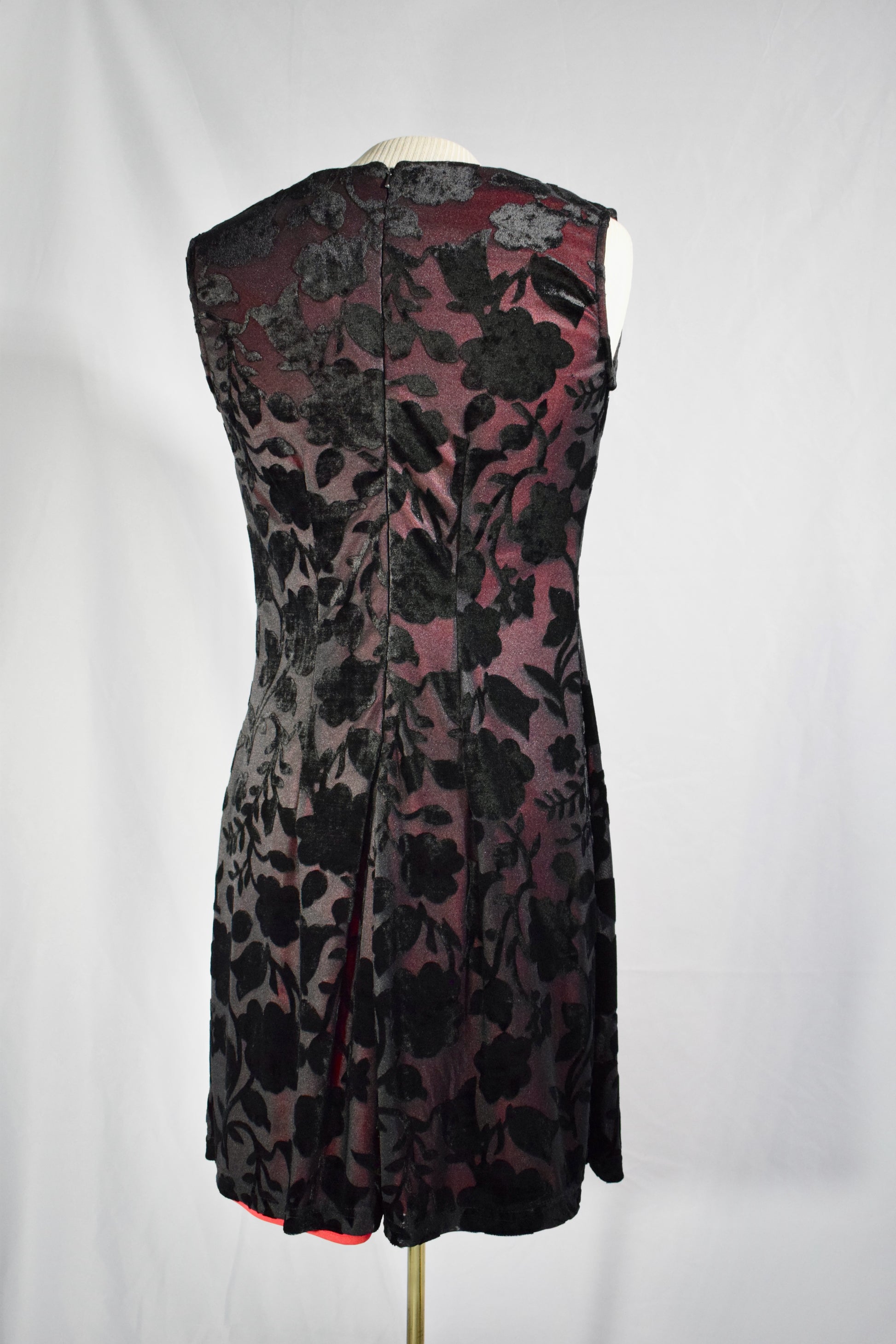 1990s black burnout velvet dress over red lining. Sleeveless. Neckline and armseyes are edged with satin piping. Stretch. Isa’s made in Hong Kong