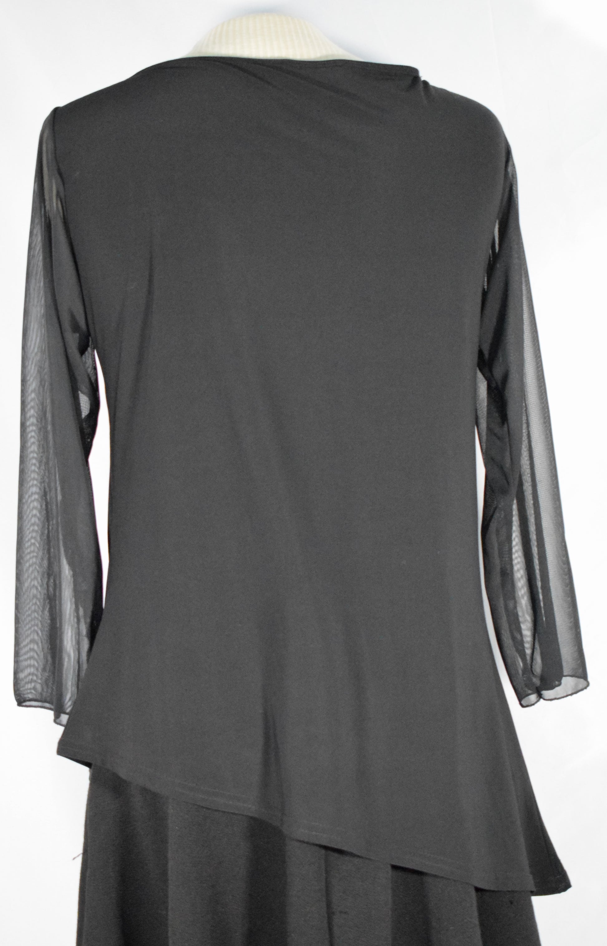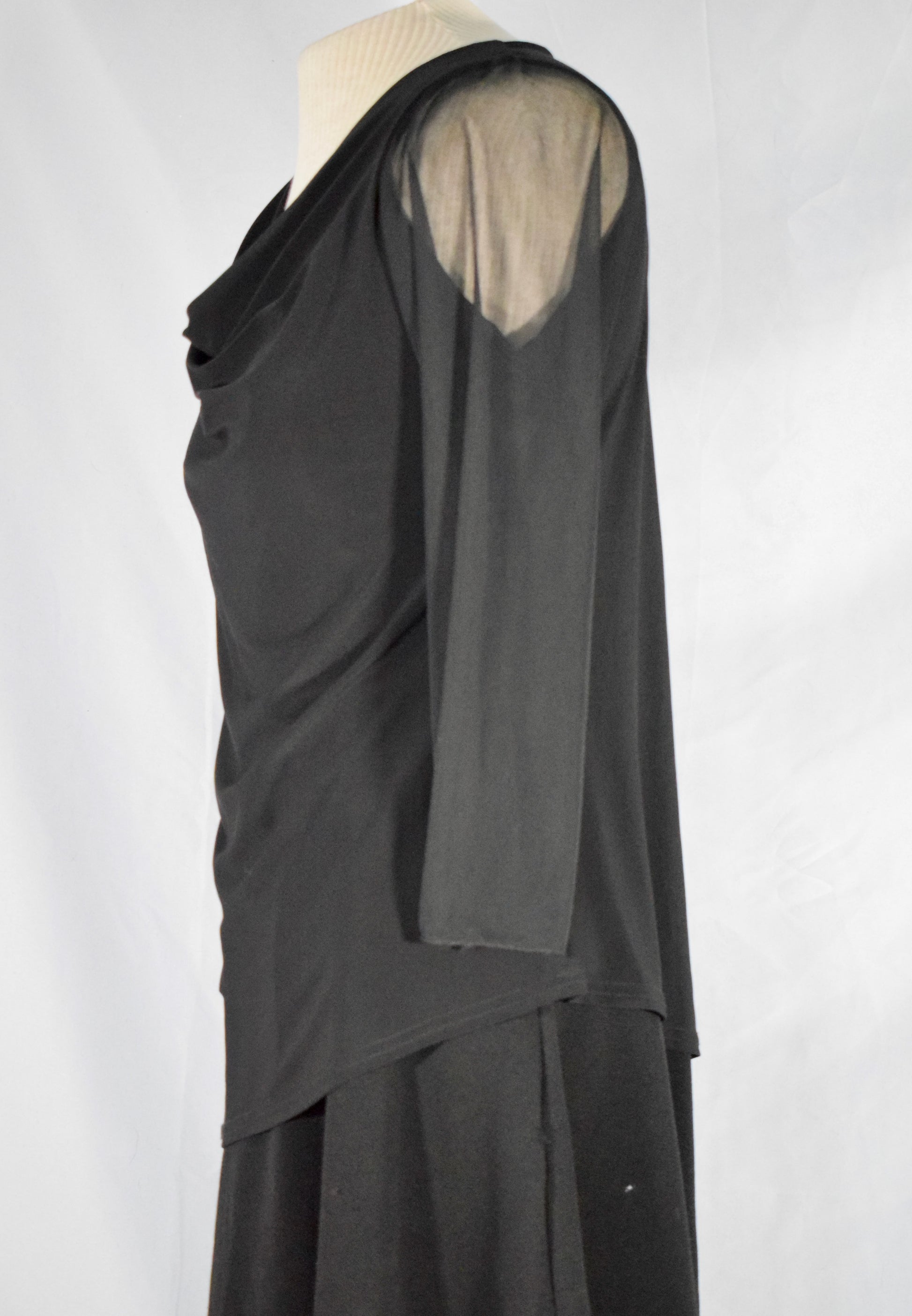 Simple cowl neck shirt with mesh sleeves and asymmetrical hemline.
