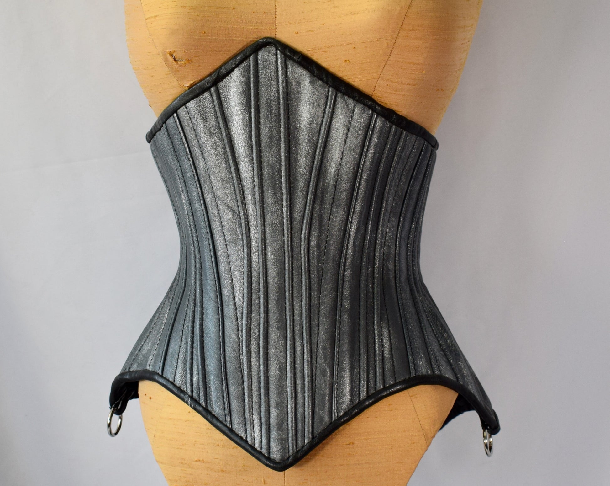 Silver leather corset made in Copenhagen by Metamorphic Quirky Couture. The front, hips, and back meet in points, with rings placed at the apex of the hips.