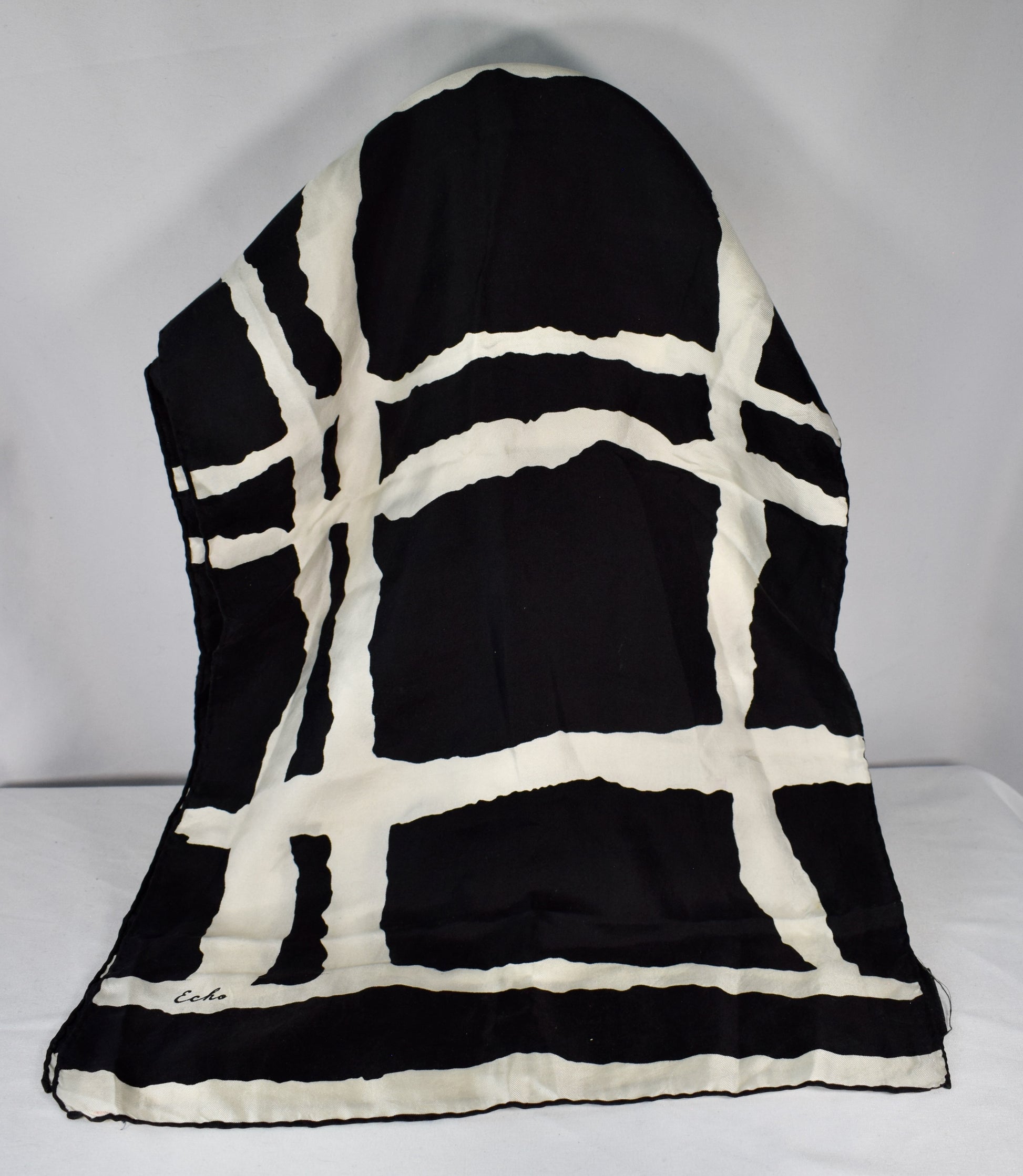 15"x67" silk scarf, by Echo. The pattern is white hashmarks against a black background.