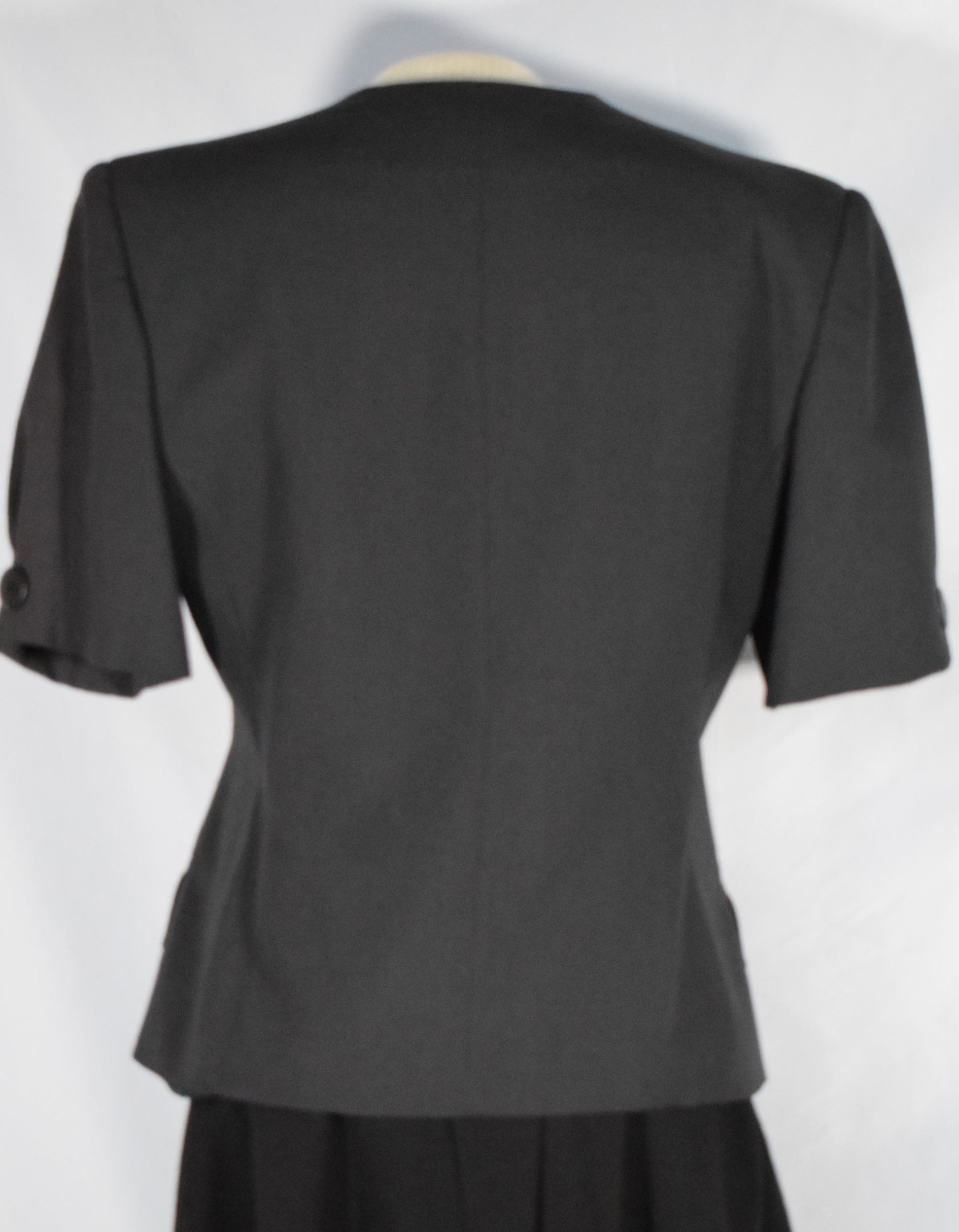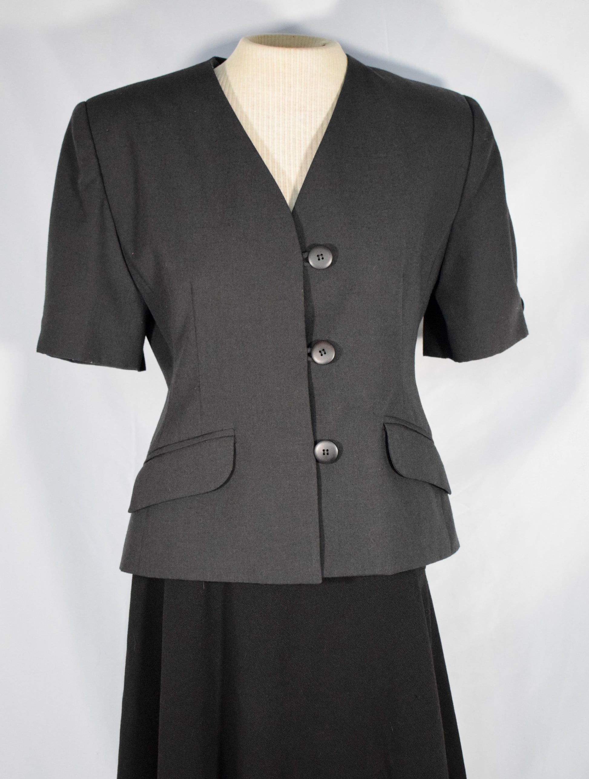 Early 2000s, short sleeved blazer with 1940s look. 3 buttons down centre front, buttons at the base of each sleeve, pockets with flaps are still tacked shut, shoulder pads. Polyester, fully lined. Made in Canada.