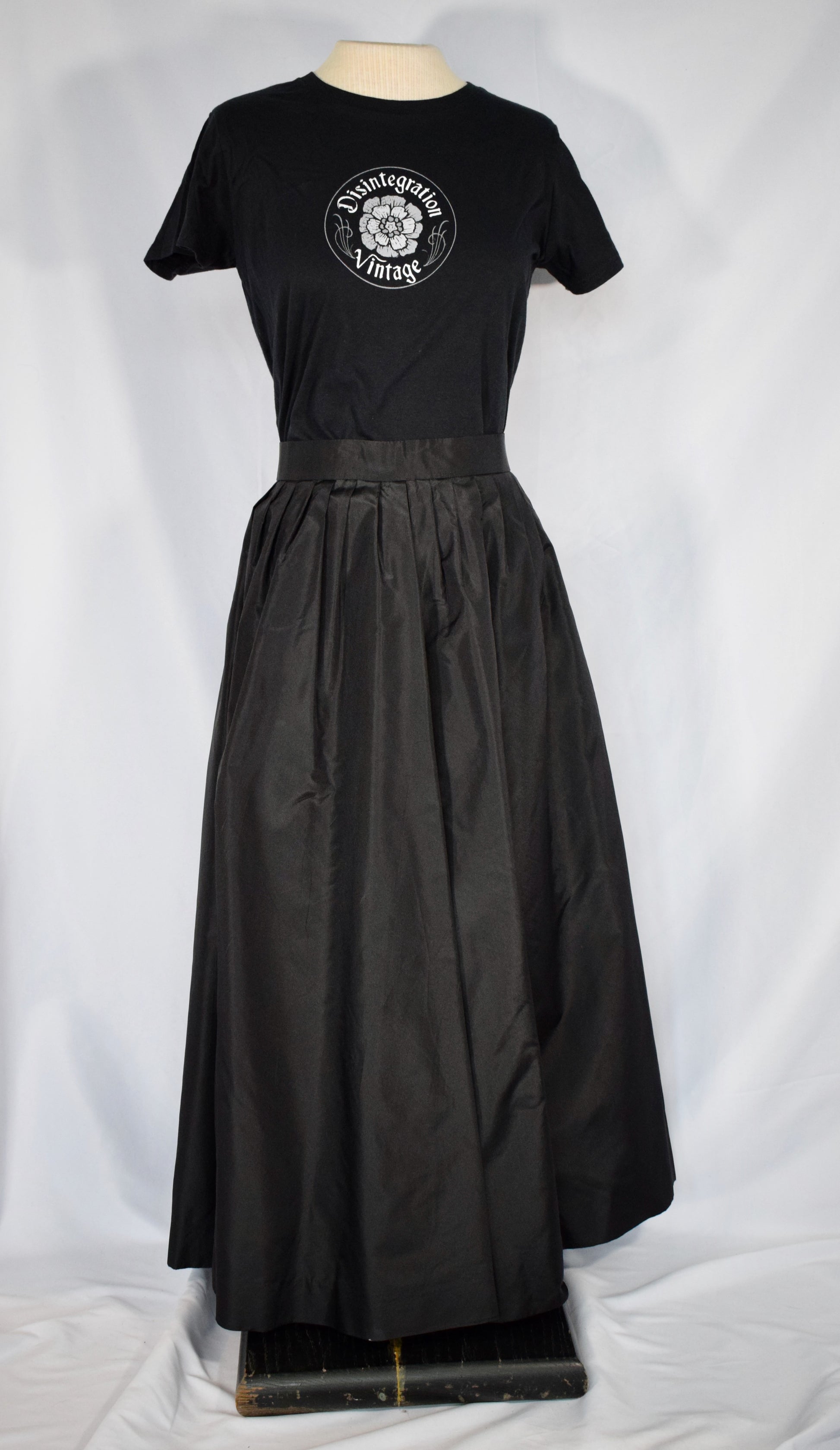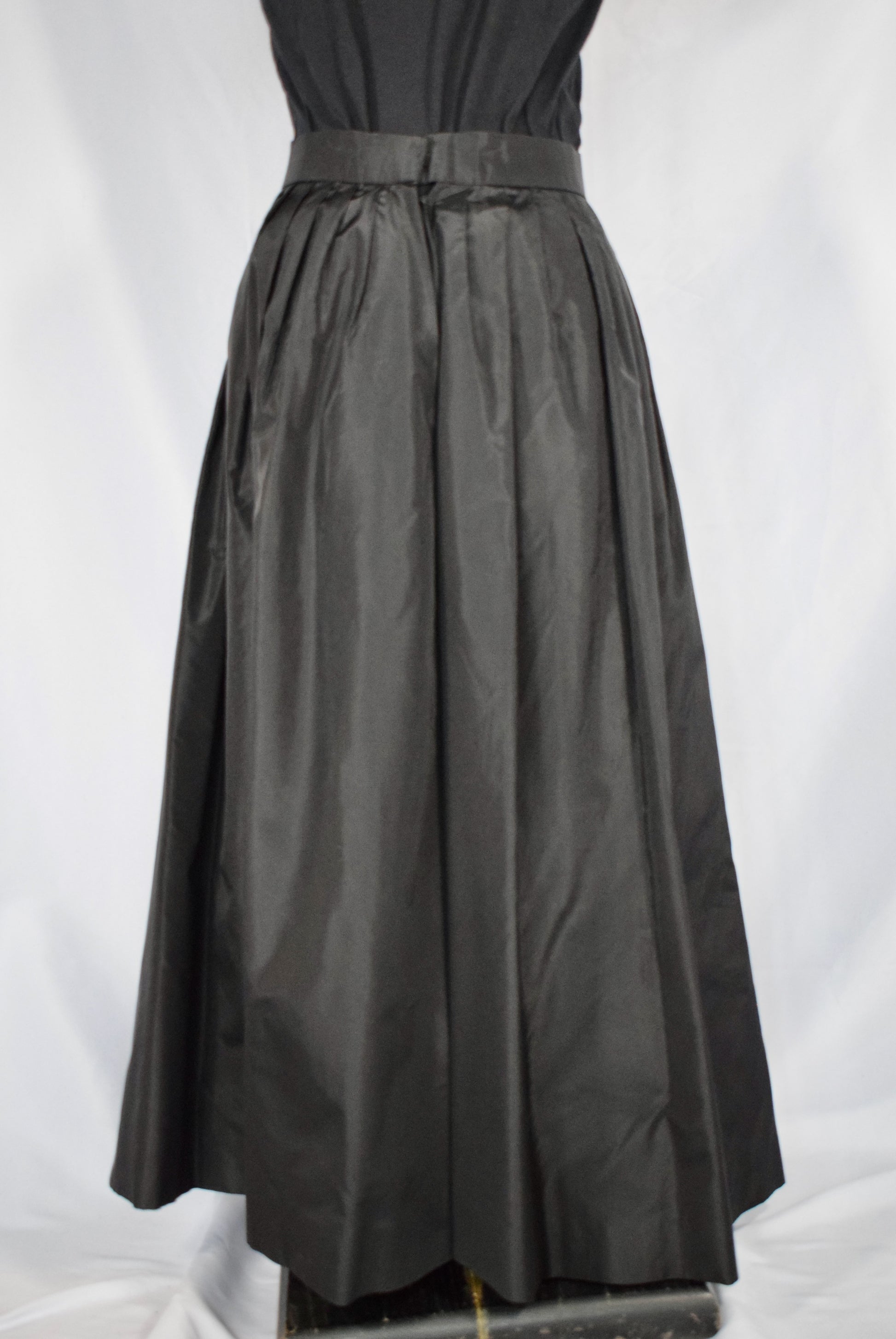 Black taffeta skirt, pleated into waistband. No label. Lined, with 4” wide horsehair crin/stiffener at the hem to maintain volume.